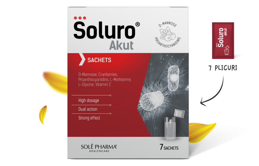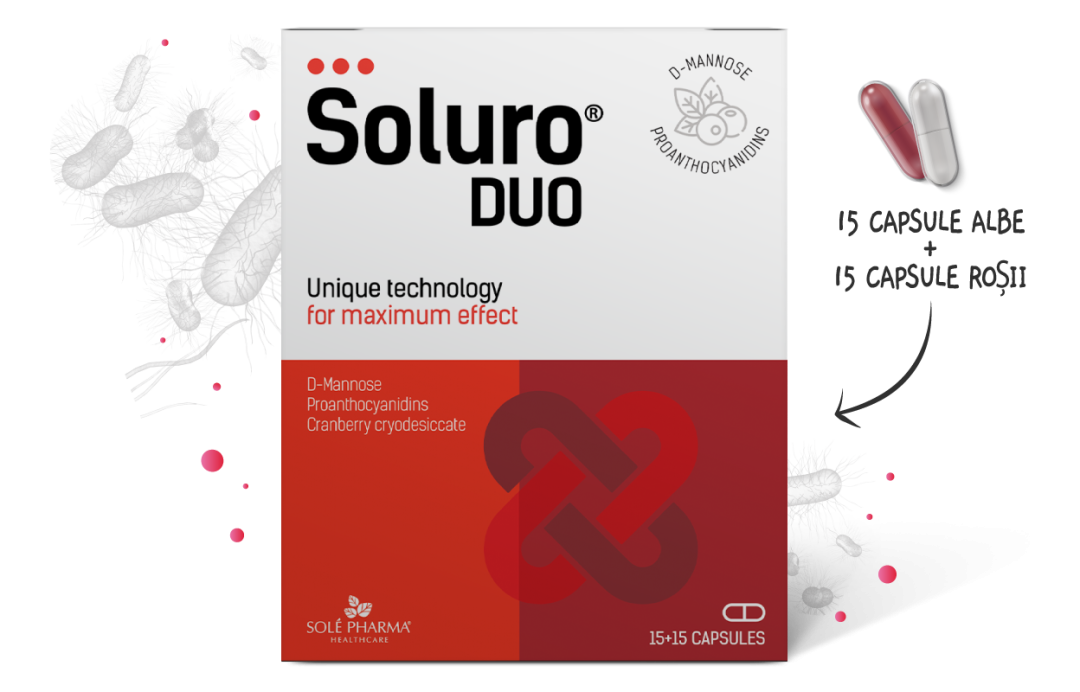 Soluro® Duo destinat pacienților cu cistită recurentă necomplicată cu simptome ușoare până la severe. Capsulele cau un efect dublu asupra bacteriilor care cauzează cistita și poate acționa ca un scut pentru a proteja tractul urinar de o altă infecție. Substanțele active sunt sunt recomandate în ghidurile Asociației europene de urologie, fiind eficiente din prima zi de administrare.